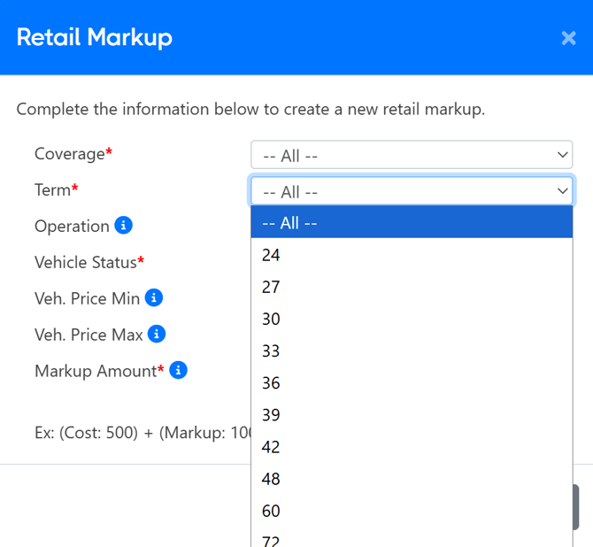 - The "Term" field can be used to define exactly what coverage term you would like your markup to apply to.