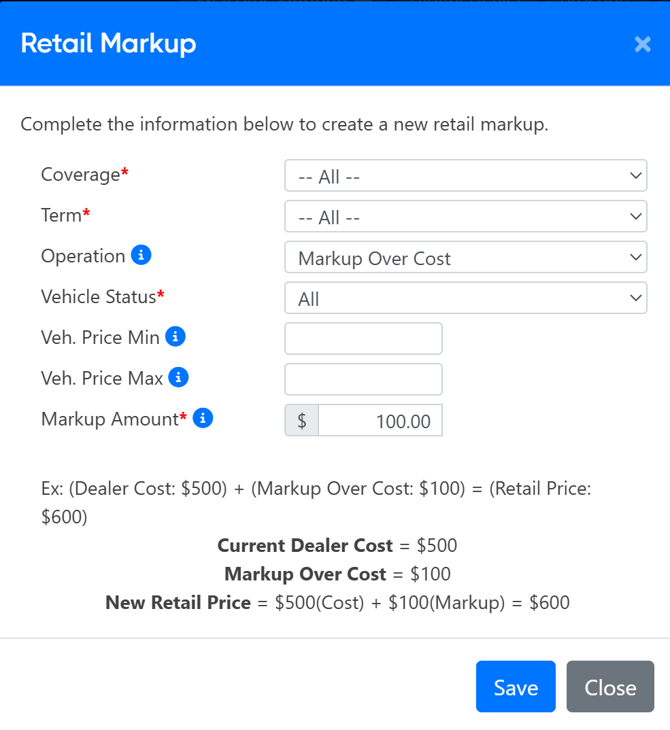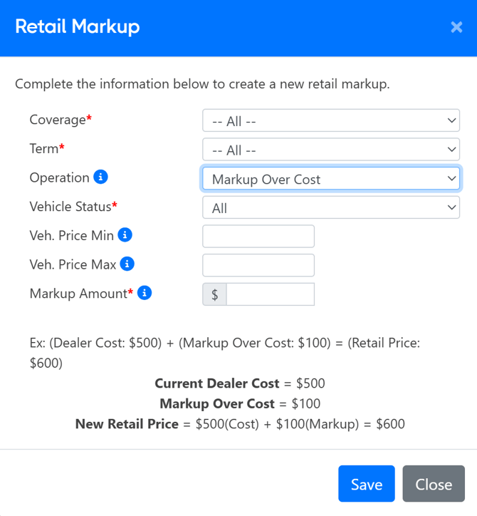 - Example: If you have $1,500.00 in the Markup Amount, the rates will always return a retail price of $1,500.00, even if the retail price or dealership cost sent to us by the vendor changes.