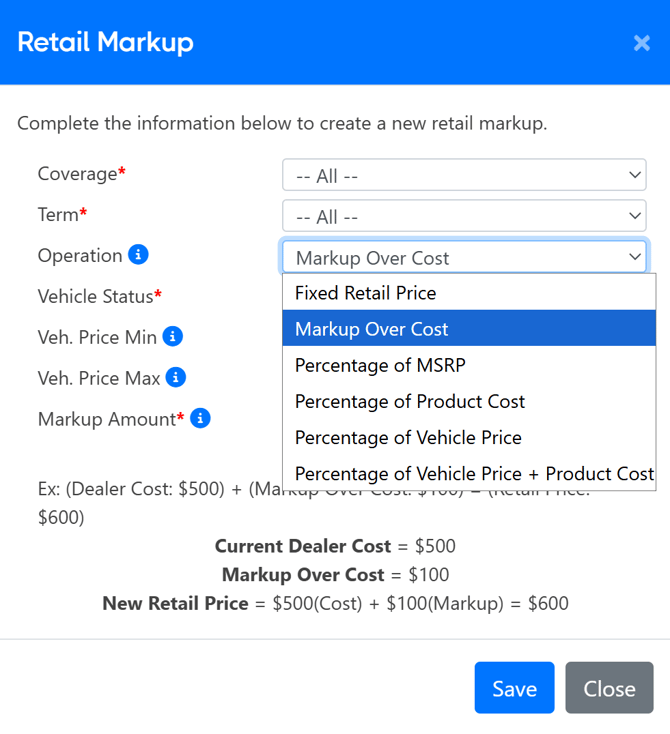 - Example: If you set this Operation with a Markup amount of 10%, the markup on each deal will change based on the Vehicle Sale Price of the unit listed on the Sale Information page. If you have a Vehicle Sale Price of $10,000, your product markup will be $1,000. If you have a deal that has a $100,000 Vehicle Sale Price, your markup will be $10,000. Your total retail price will be the markup plus dealership cost. If you have a dealer cost of $350, your total retail price will be $10,350.