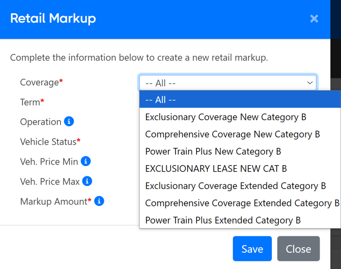 Note: If you have one markup set to "All" and another markup set to a specific line item, the specified markup will take precedence. Review this for Coverage, Term, and Vehicle Status.